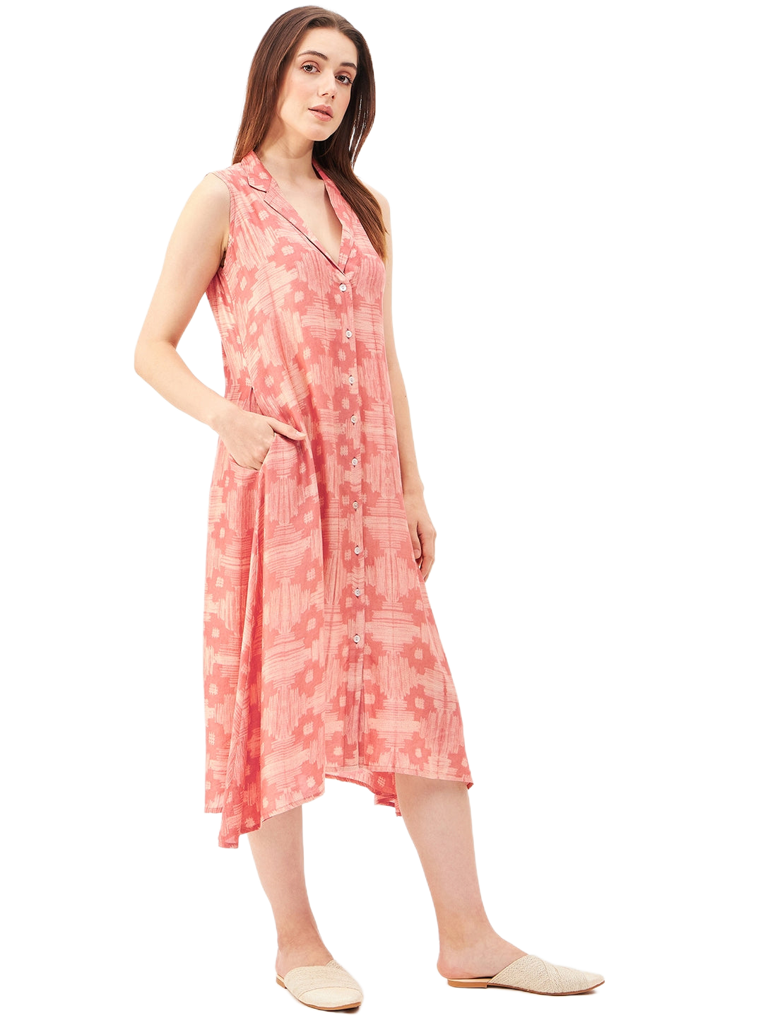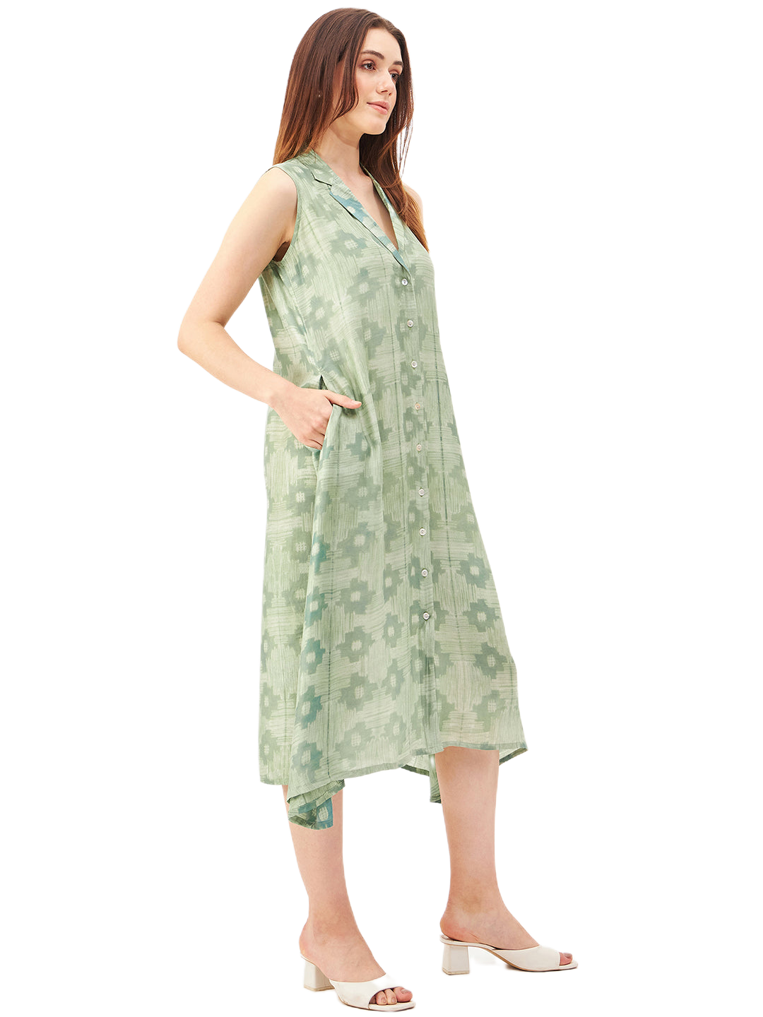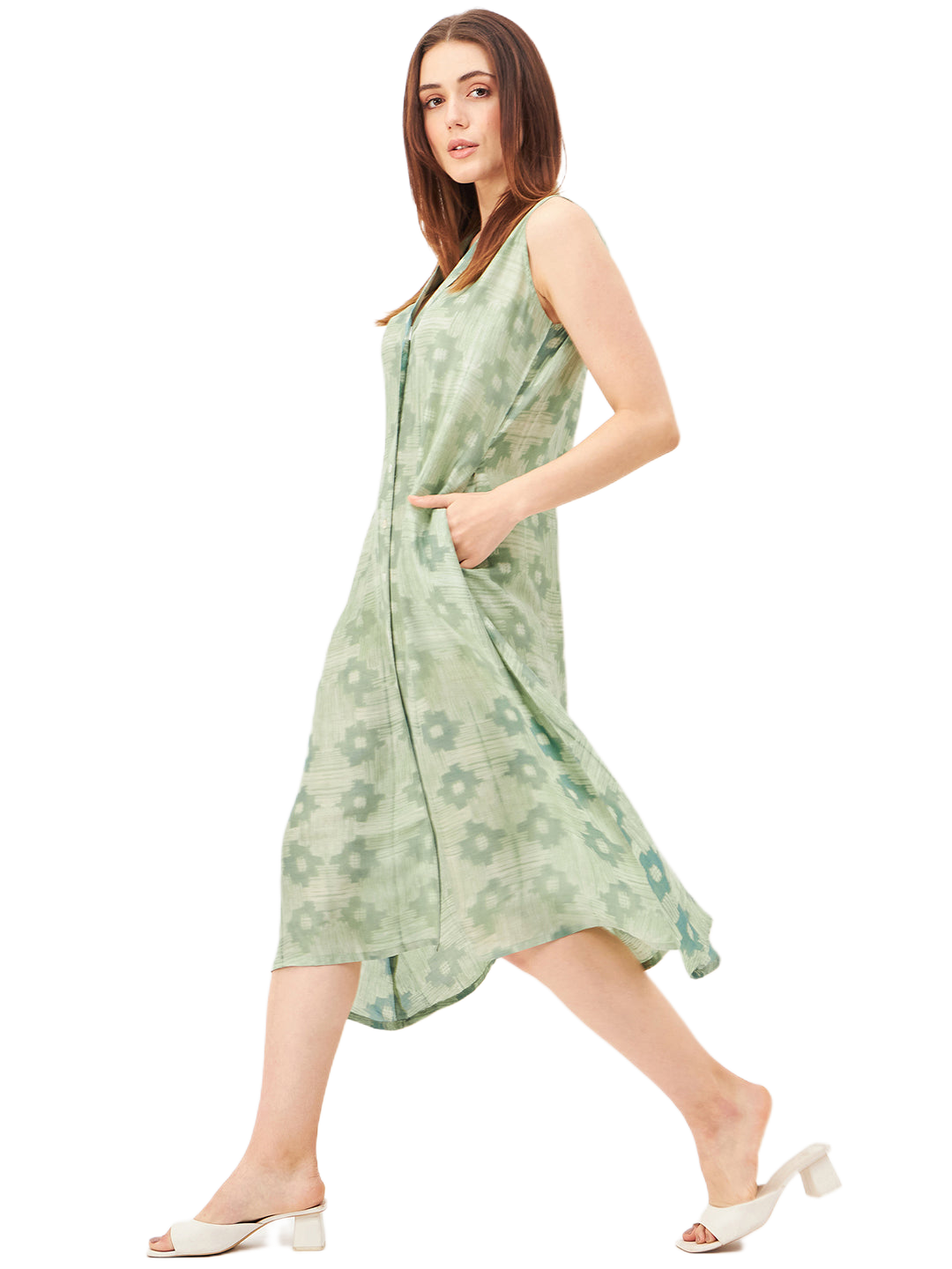 Step into elegance with this handcrafted Shibori dress, designed in a luxurious blend of soft silk and cupro cotton. The round-neck, sleeveless silhouette offers effortless sophistication, while the calf-length cut brings modern versatility.