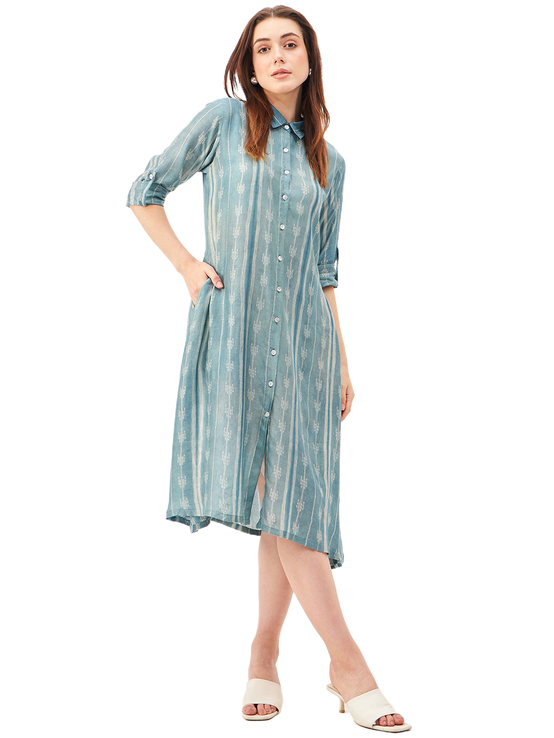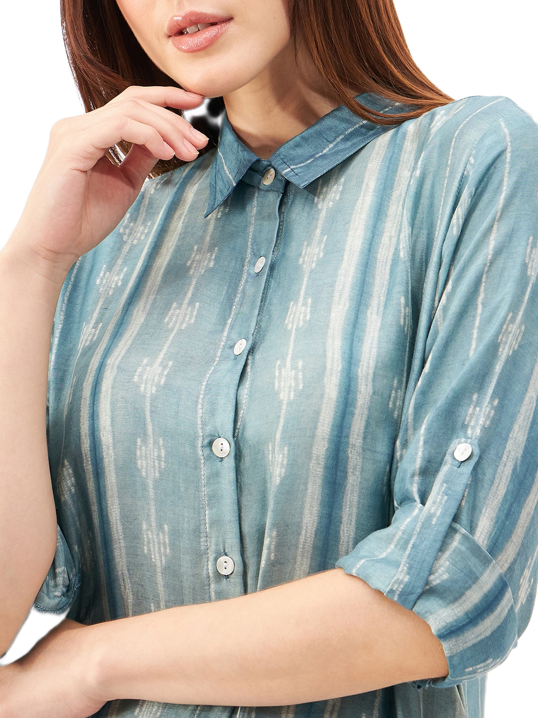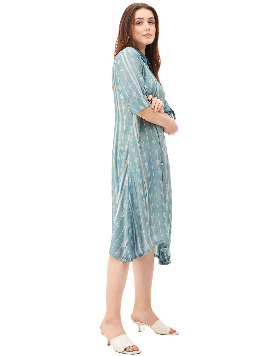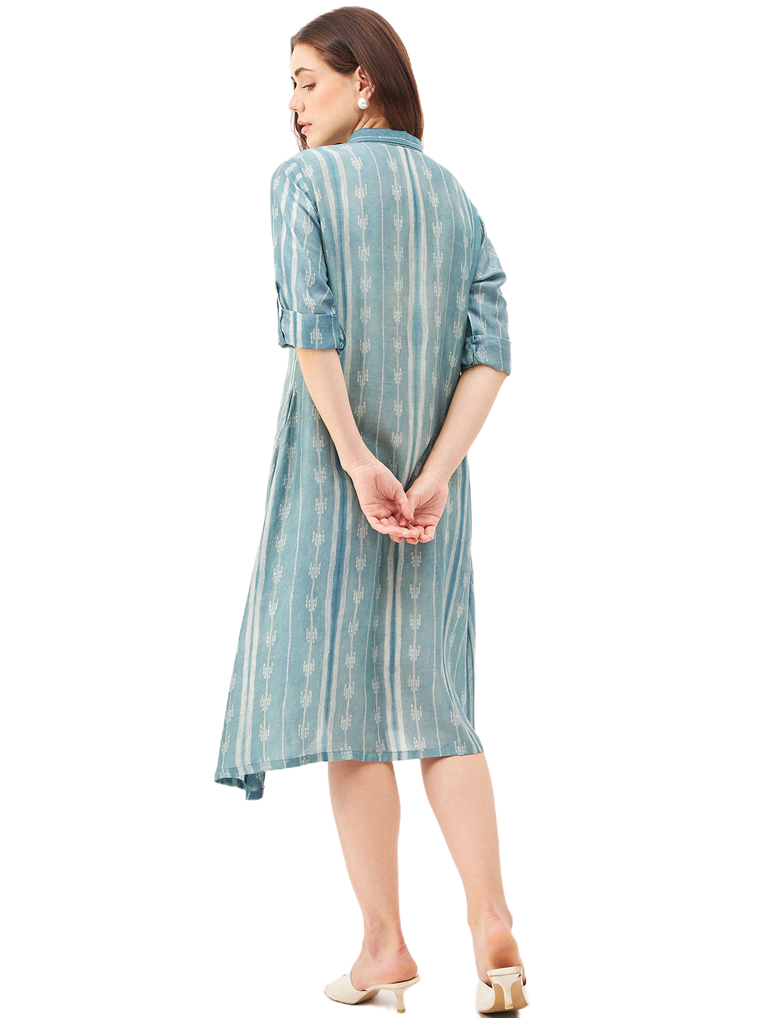 A graceful A-line dress featuring a classic shirt collar and a front-open design, crafted from a luxurious blend of soft silk and cupro cotton for ultimate comfort and breathability. The long sleeves can be effortlessly folded and secured with a button and fabric holder, adding versatility to the look. Handcrafted with exquisite Shibori technique, this dress showcases an asymmetrical hemline that brings modern elegance to its silhouette. Finished with delicate shell button closures, it’s a perfect blend of artisanal detail and timeless style.