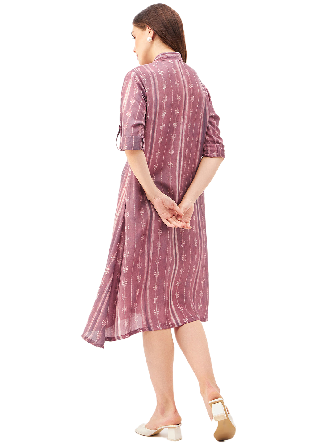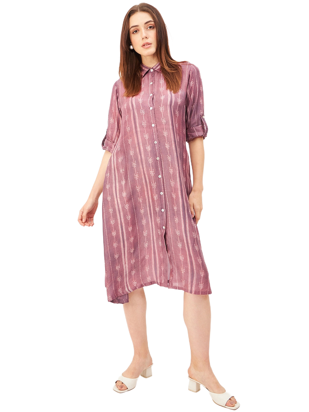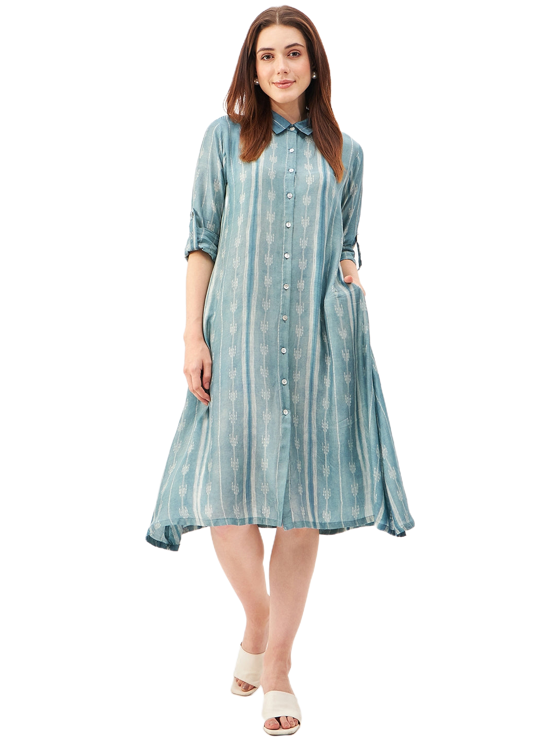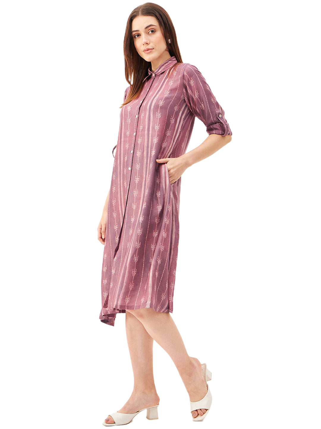 A graceful A-line dress featuring a classic shirt collar and a front-open design, crafted from a luxurious blend of soft silk and cupro cotton for ultimate comfort and breathability. The long sleeves can be effortlessly folded and secured with a button and fabric holder, adding versatility to the look. Handcrafted with exquisite Shibori technique, this dress showcases an asymmetrical hemline that brings modern elegance to its silhouette. Finished with delicate shell button closures, it’s a perfect blend of artisanal detail and timeless style.