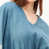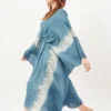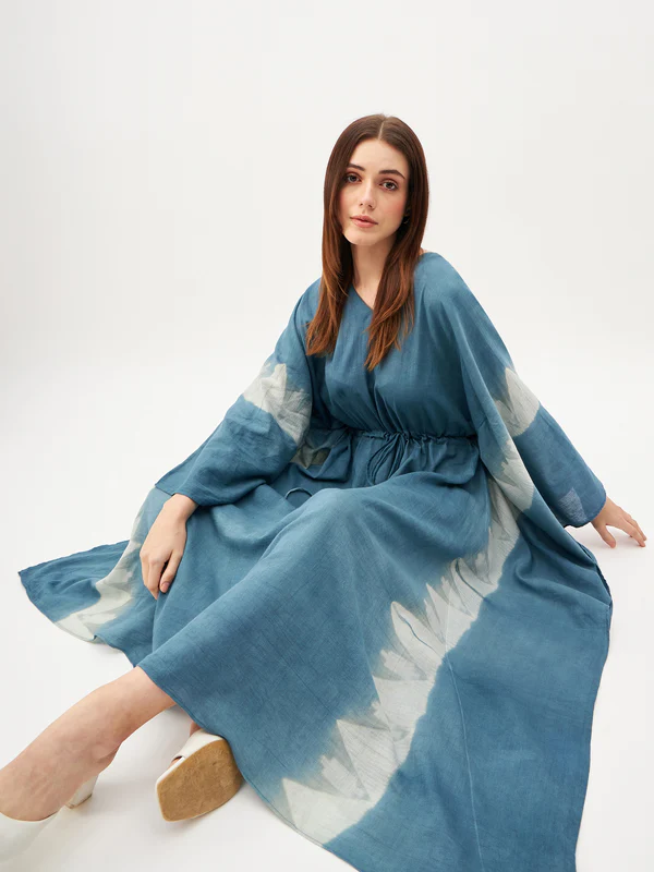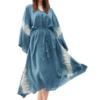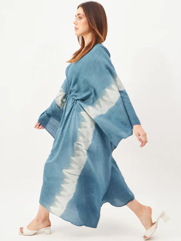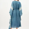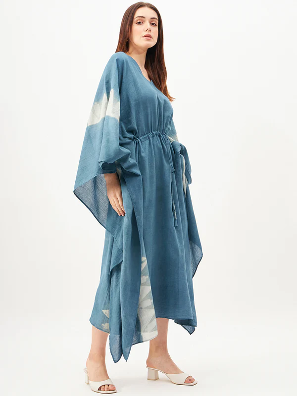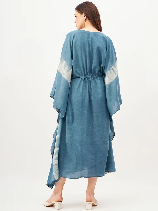 Indigo kaftan dress has a V-neck, short sleeve, and flared hem