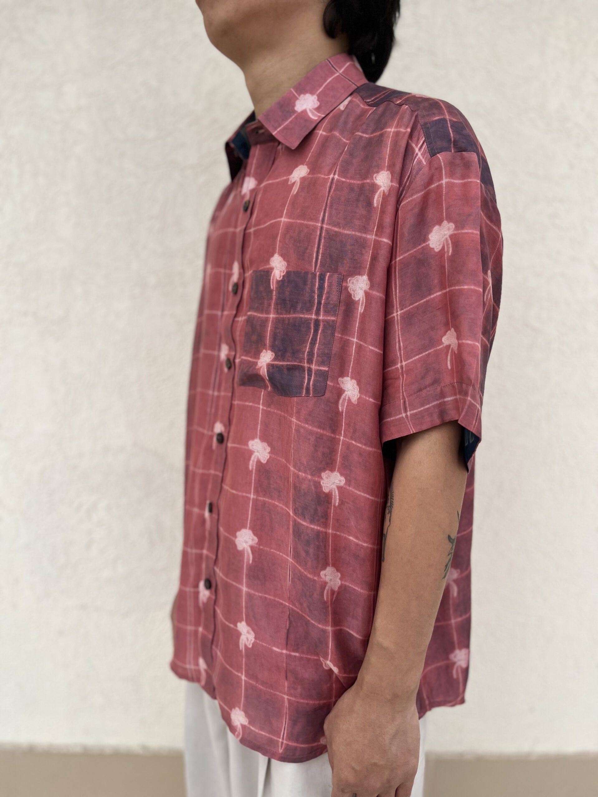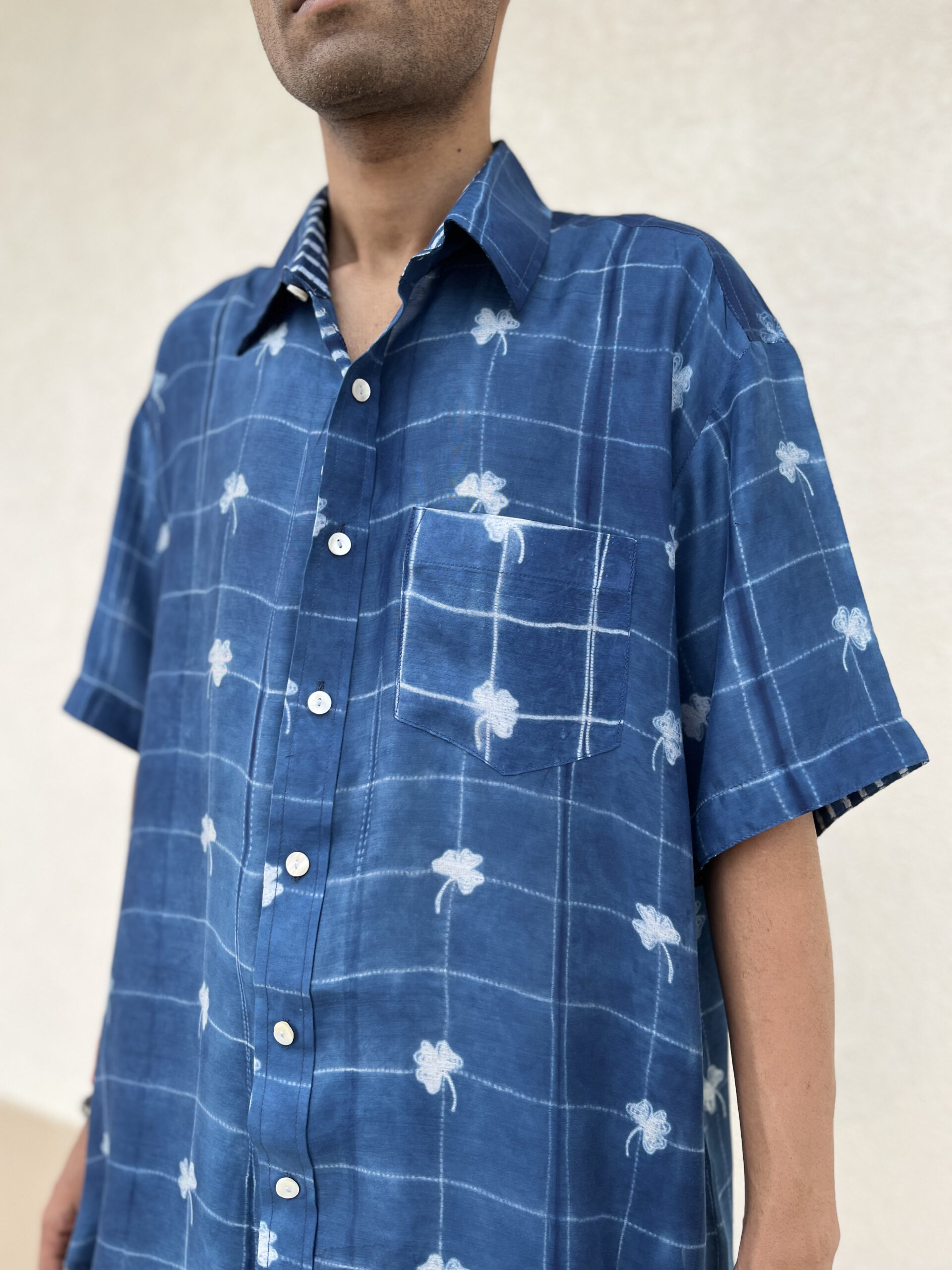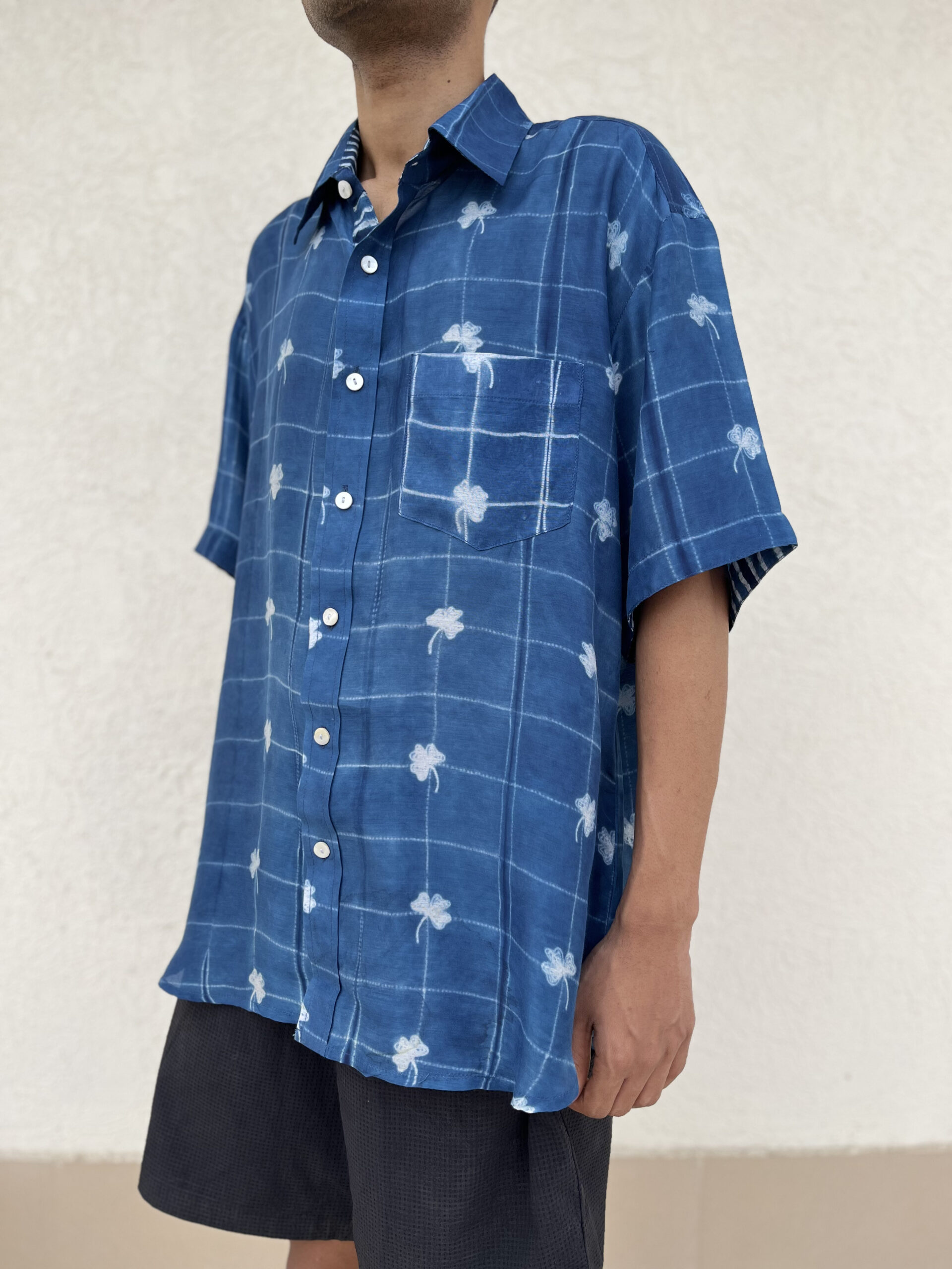 and is detailed with a different handcrafted shibori on the placket, pocket, and sleeve folds. A refined everyday essential