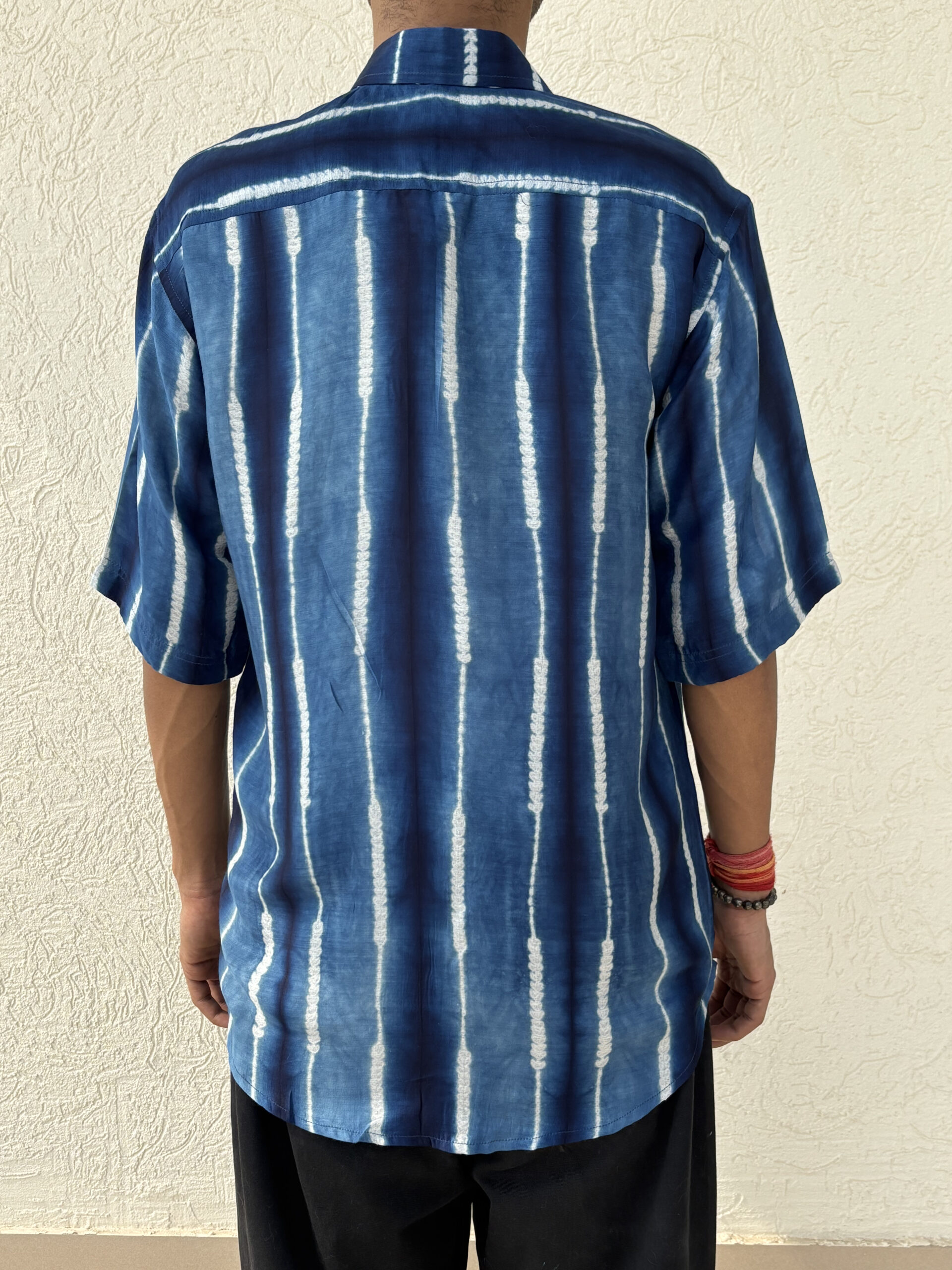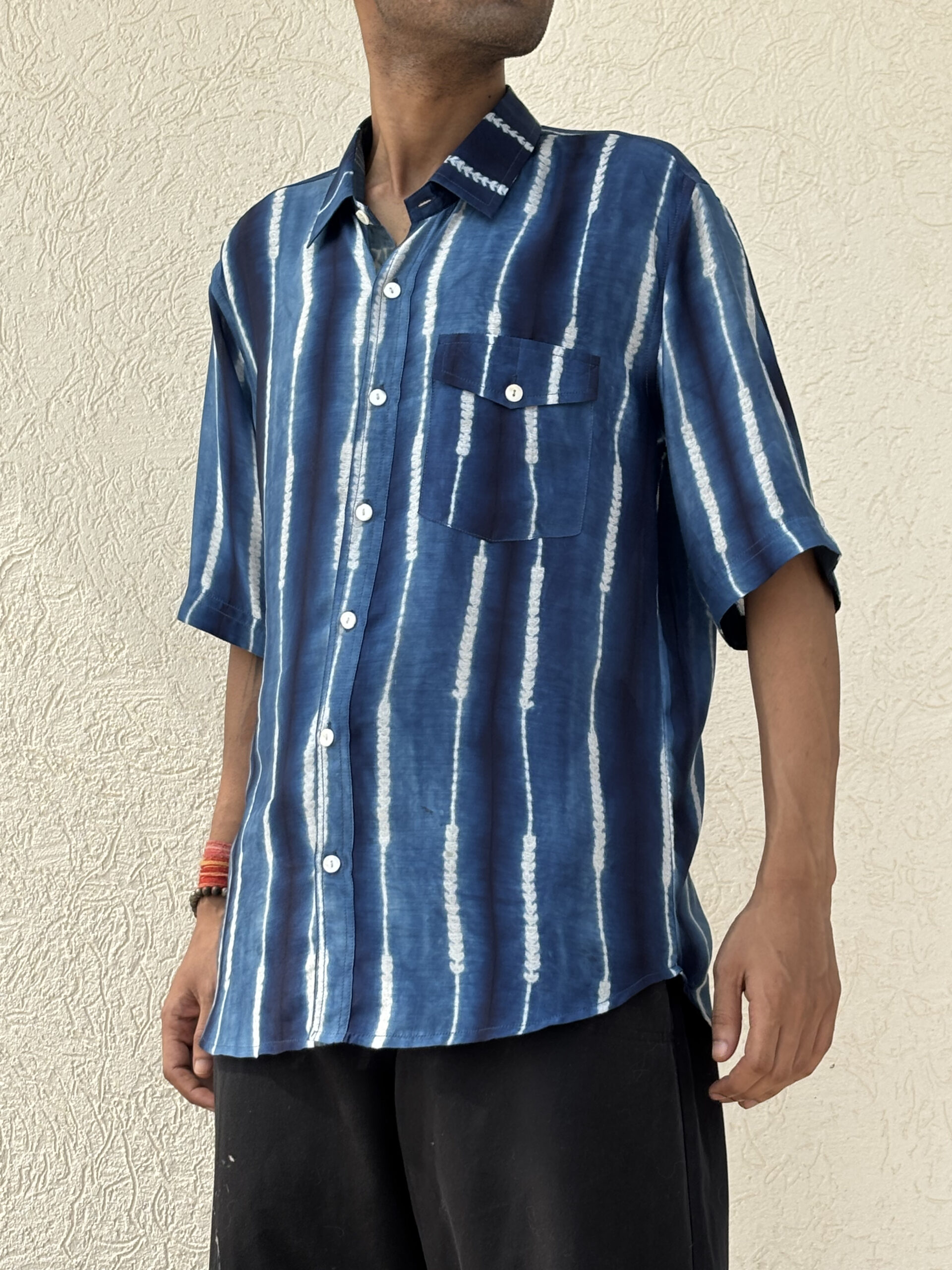 This half-sleeve men’s casual shirt is crafted from a plant-based silk and cupro cotton blend,