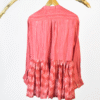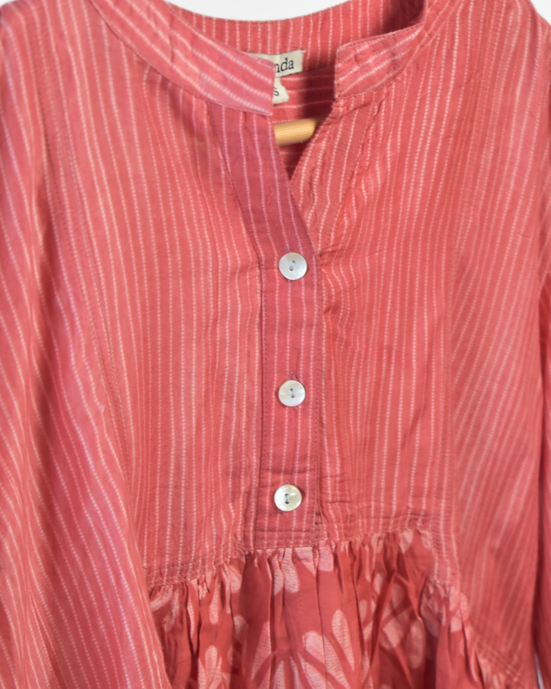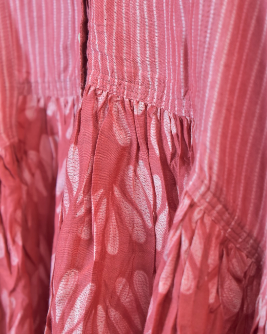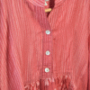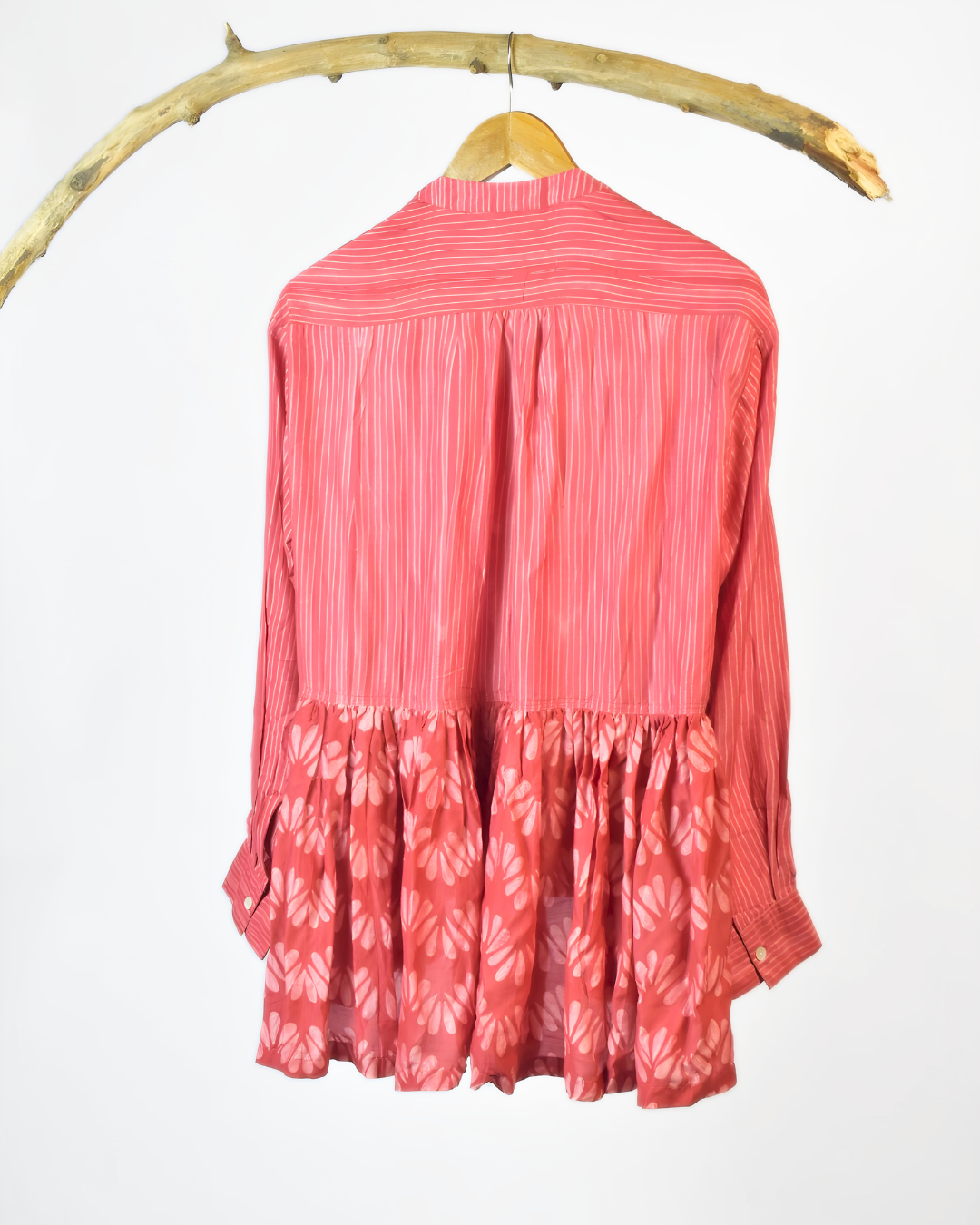 Crafted in plant-based silk/cotton, this co-ord set features a chic top having a striped bodice with a delicately printed skirt in a stylish low-high hemline. Designed with full sleeves and a classic Chinese collar, it blends modern elegance with timeless grace. The look is completed with loose matching palazzos, offering comfort and effortless sophistication.