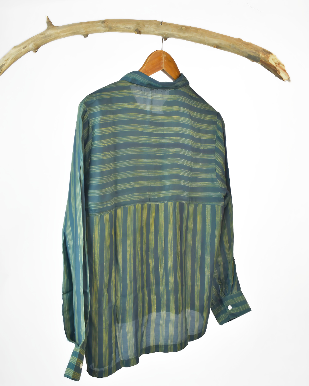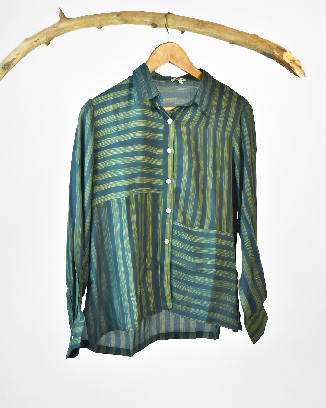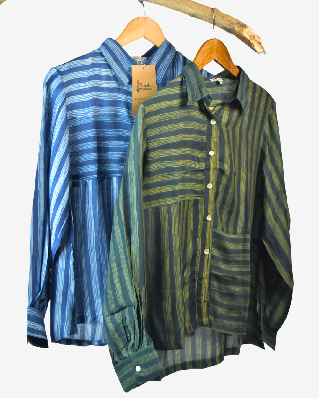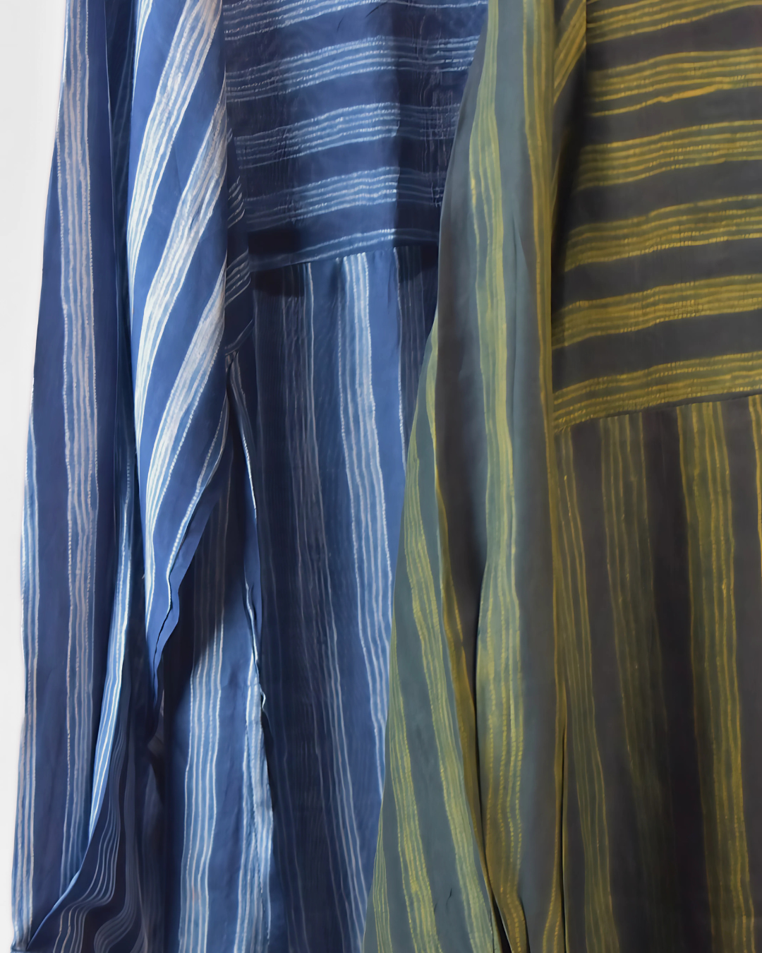 Crafted in plant-based silk and cupro cotton, this soft-textured co-ord set pairs a striped front-open shirt with uniquely designed loose pants. A blend of comfort, elegance, and modern style.